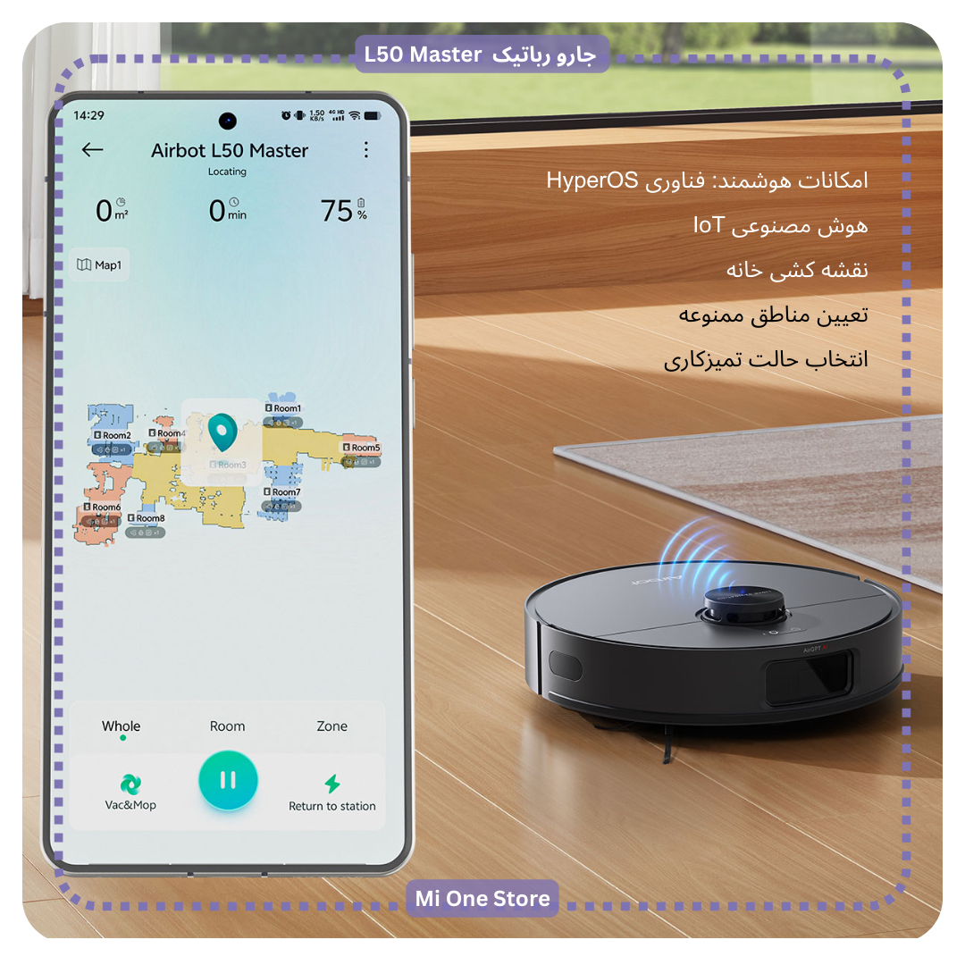 Airbot L50 Master به صورت کامل با اپلیکیشن Mi Home شیائومی سازگار است. شما میتوانید از طریق گوشی هوشمند، عملیات نظافت را کنترل نماید، نقشه خانه را مشاهده کرده و برنامههای زمانبندی شده تنظیم کنید.