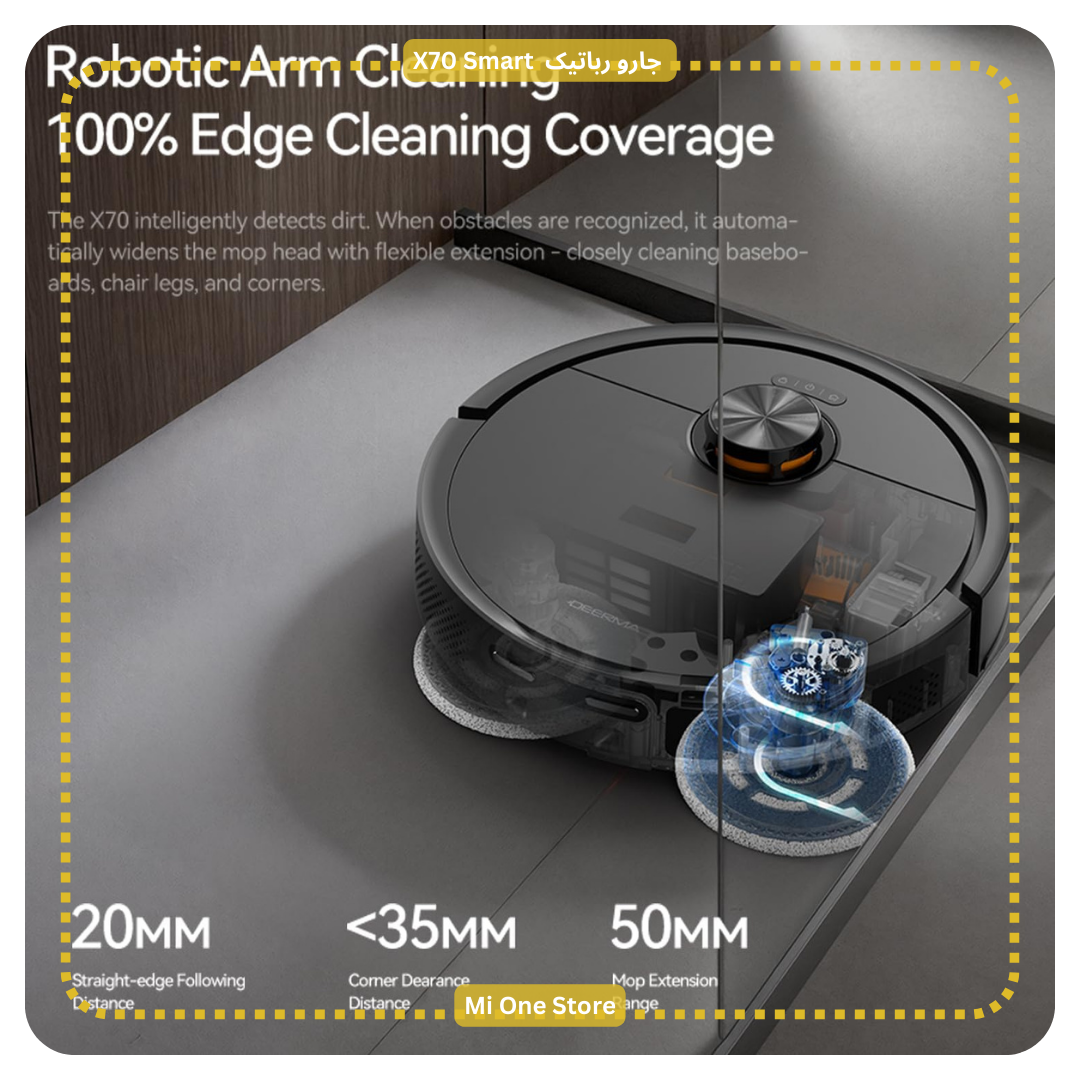 این ربات دارای بازوی رباتیک هوشمند است که برای تمیز کردن گوشهها، لبه دیوار و قرنیزها طراحی شده و هیچ نقطهای از خانه را جا نمیاندازد.