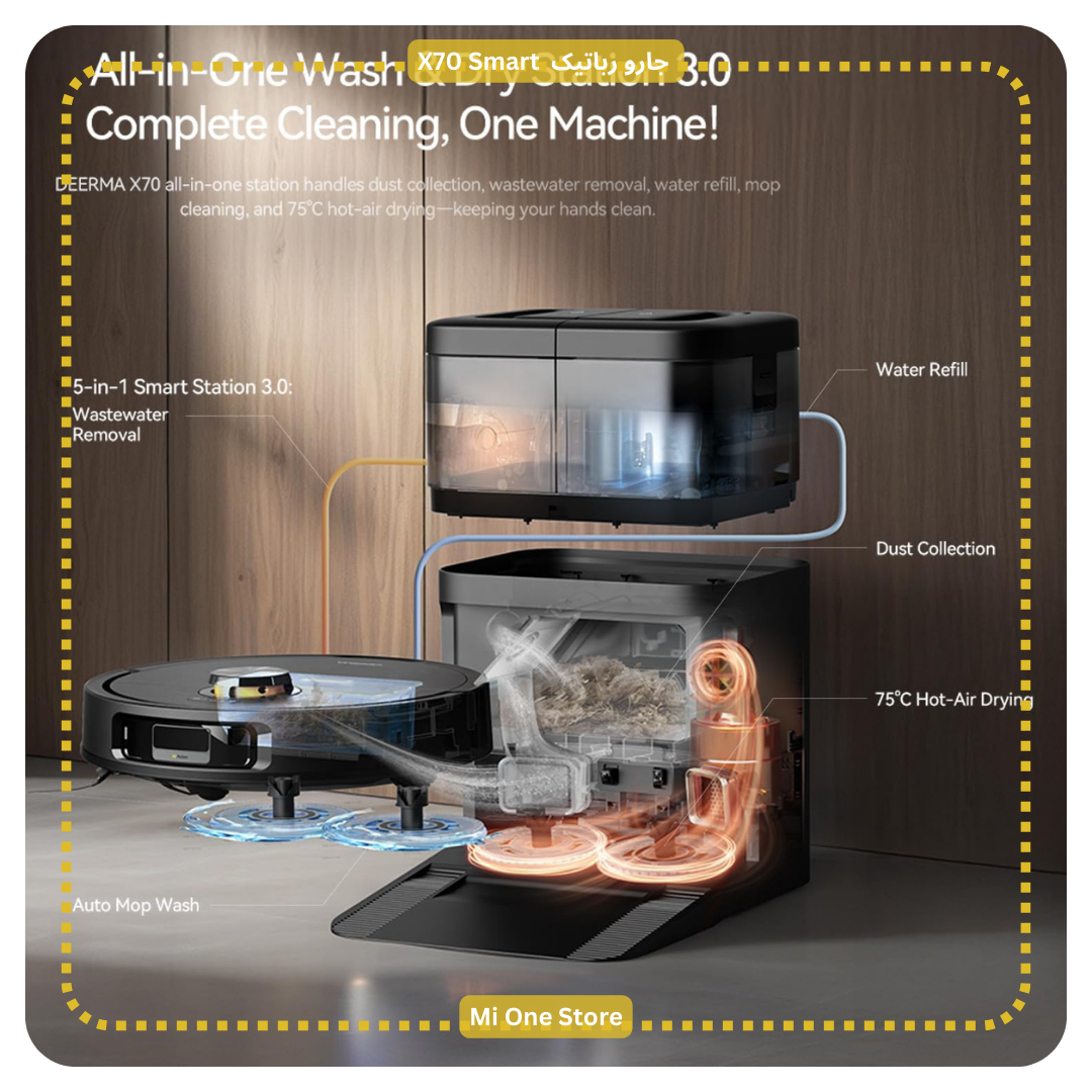 جارو رباتیک X70 دارای سیستم تخلیه خودکار و خشککردن با هوای گرم ۷۵ درجه میباشد.
