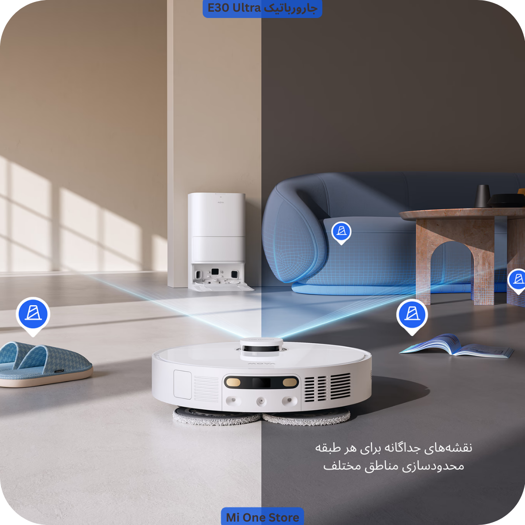 E30 Ultra مناسب خانههای چندطبقه است. شما میتوانید نقشههای جداگانه برای هر طبقه تعریف کنید، مناطق مختلف را محدودسازی نماید، بخشهای حیوانات خانگی را مشخص کنید. این ویژگی نظافت حرفهای و دقیقتری را تضمین میکند.