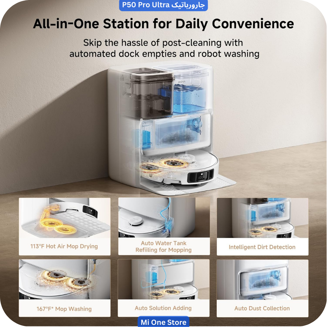 جارورباتیک مدل Mova P50 Pro Ultra نظافت خودکار کامل را برایتان فراهم میکند. یعنی پس از نصب اولیه و پر کردن مخزن آب/پاککننده، شما میتوانید هفتهها خانه را نظافت کنید بدون اینکه کیسه زباله یا پد تی را دستی خالی یا بشویید. جارورباتیک P50 Pro Ultra گزینهٔ قدرتمندی است این دستگاه نه فقط گرد و غبار و زبالهها را جارو میکند، بلکه تی میکشد، پد تی را شستوشو و خشک میکند و با حداقل دخالت شما، نظافت خانه را مدیریت میکند. Mova P50 Pro Ultra Robot Vacuum کنترل از طریق اپ و دستیار صوتی تلاش میکند بار نظافت خانه را تقریباً به صفر برساند. اگر به دنبال نظافتی بدون دردسر، پیوسته و کارآمد هستید، این مدل میتواند «تکمیل خانه هوشمند» شما باشد. ما استفاده از این جارورباتیک هوشمند را به شما پیشنهاد میکنیم.