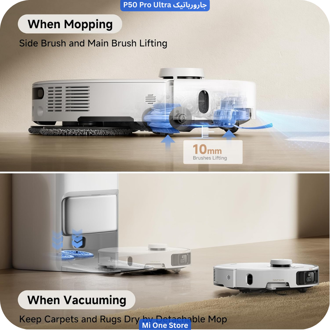 در فرش یا مکانهایی که فرش دارید، جارورباتیک P50 Pro Ultra بهصورت هوشمند بین حالت جارو و تی جابجا میشود، تیها را بلند میکند یا جدا میکند تا فرش خیس نشود، بنابراین فرشها خشک و تمیز باقی میمانند.