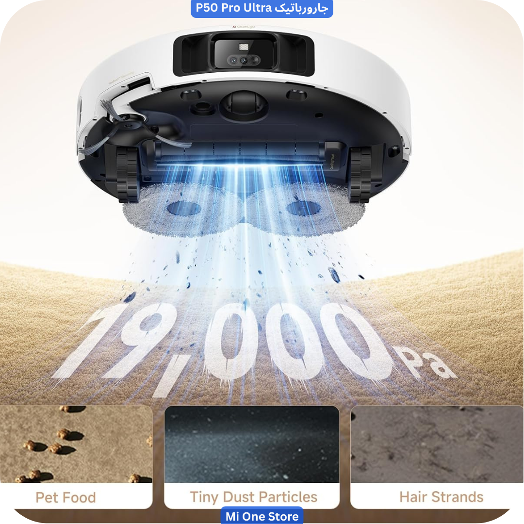 جارورباتیک P50 Pro Ultra دارای مکش قوی و عملکرد جاروبرقی بهبود یافته است، در این دستگاه حذف گرد و غبار، مو و زبالههای مختلف با قدرت مکش 19,000 پاسکال انجام میشود این مقدار برای جاروبرقی رباتیک بسیار بالا محسوب میشود و به آن امکان میدهد گرد و غبار، مو، ذرات ریز و زبالههای درشتتر را از سطوح مختلف مانند کف سخت، سرامیک، کف چوبی و حتی فرش با تراکم متوسط به خوبی جمع نماید.