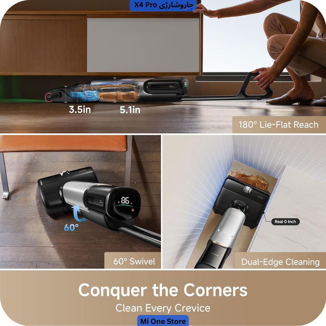 یکی از ویژگیهای کاربرپسند جاروشارژی X4 Pro، طراحی هوشمندانه آن برای استفاده راحت و پوشش کامل فضای خانه است. این جاروشارژی قابلیت خوابیدن کامل (180° Lay-Flat) و چرخش 60° را دارد. این طراحی امکان میدهد جارو به راحتی زیر مبل، تخت یا زیر میز برود و همچنین گوشهها و کنارههای دیوار را بهخوبی تمیز کند. این دستگاه دارای هد روشنایی LED روی برس است در فضاهای تاریک یا زیر مبلمان که دید کم است، چراغ LED کمک میکند ذرات گرد و غبار یا موهایی که به سختی دیده میشوند، آشکار شوند. پس از استفاده، کافی است جارو را به سمت داک ببرید و آن را فشار دهید تا خودکار خاموش شده و شارژ شود نیازی به بلند کردن یا جاگذاری پیچیده ندارد.