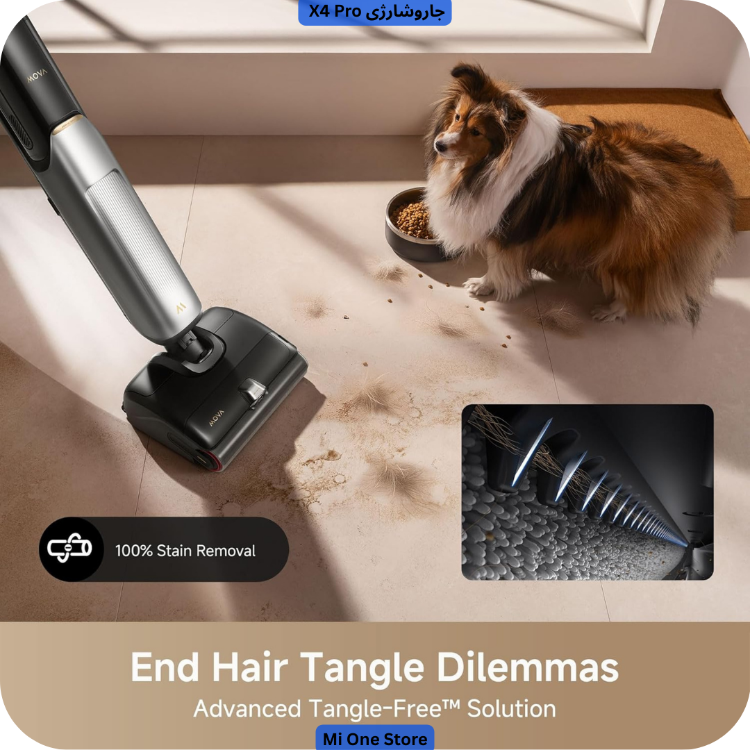 اگر در خانهتان حیوان خانگی دارید یا افراد با موی بلند زندگی میکنند، احتمال گرفتن مو روی برس جارو زیاد است و تمیز کردن آن دردسر دارد. Mova X4 Pro این مشکل را با فناوری مناسب رفع کرده است. این جاروشارژی دارای برس با طراحی دندانهدار و اسکرِیپر مخصوص است بدین ترتیب که تیغه یا اسکرِیپر با دندانههایی مثل شانه طراحی شده است که موها را به طور مؤثر از برس جدا میکند و از گره خوردن جلوگیری میکند. عملکرد ۱۰۰٪ بدون گره (Tangle-Free) دارد کاربران گزارش دادهاند که حتی پس از استفاده مکرر، مو یا پر حیوانات روی برس گیر نمیکند و نیازی به دستکاری دستی نیست. جاروشارژی X4 Pro دارای مکش قوی همزمان با فناوری ضد گره است. این دستگاه با مکش ۲۰,۰۰۰ پاسکال در کنار اسکرِیپر، به راحتی موها و گرد و غبار را جمع میکند بدون اینکه موها دور برس بپیچند. بنابراین این جارو انتخاب بسیار مناسبی برای خانههایی با حیوان خانگی، کودکان یا فضای پرتردد است.