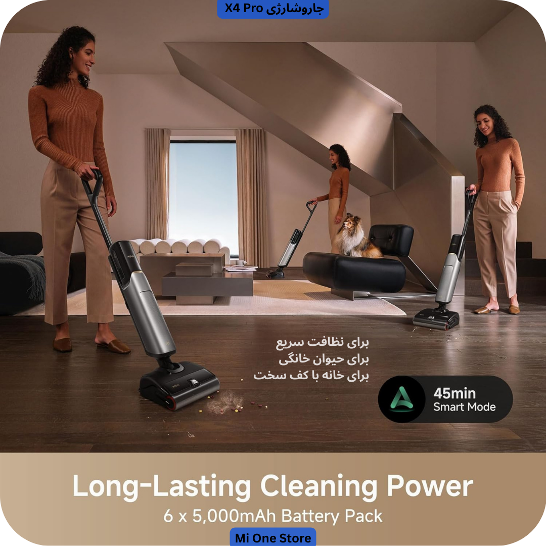 جاروشارژی X4 Pro قابلیت کار همزمان جارو و زمینشویی دارد، برخلاف جاروبرقیهای سنتی، این مدل قادر است همزمان زمین را مرطوب شسته و آلودگیها را جمع کند. بنابراین مناسب برای سطوح سخت مانند پارکت، سرامیک، لمینت، و کفپوشهای مشابه است.