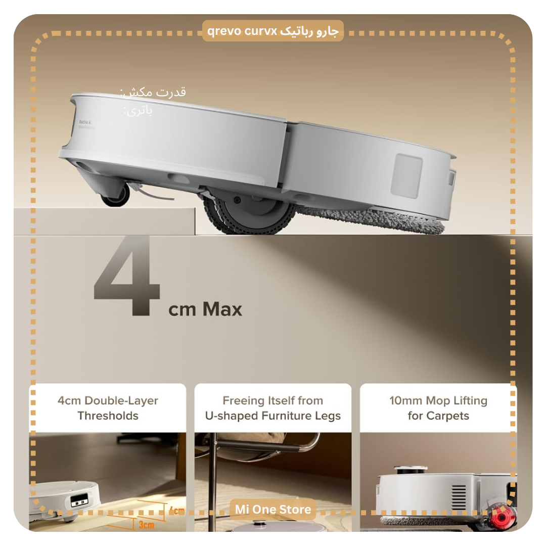 جارورباتیک qrevo curvx دارای سیستم AdaptiLift Chassis نوآوری منحصربهفردی در صنعت جاروهای رباتیک است که برای اولین بار توسط Roborock معرفی شد. عبور روان از آستانهها و سطوح ناهموار دارد. این شاسی هوشمند میتواند تا ۴ سانتیمتر بالا بیاید و بخشهای مختلف بدنه (جلو، عقب، چپ و راست) را بسته به نوع سطح تنظیم کند.