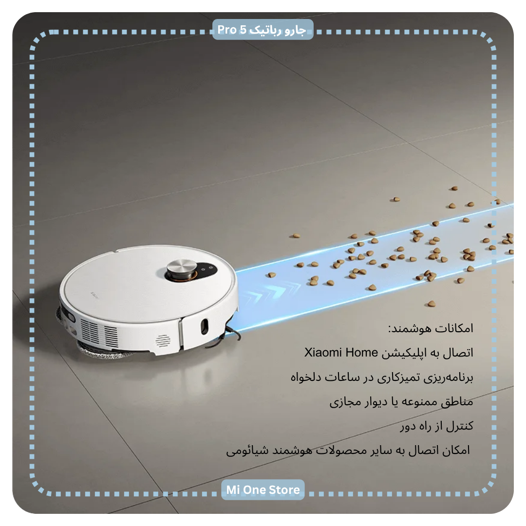 جارو رباتیک ۵ پرو دارای برنامهریزی هوشمند و اتصال به اپلیکیشن Xiaomi Home است. این ربات برنامهریزی تمیزکاری در ساعات دلخواه دارد، تعریف مناطق ممنوعه یا دیوار مجازی انجام میباشد، کنترل از راه دور و شروع تمیزکاری حتی وقتی خانه نیستید، امکان اتصال به سایر محصولات هوشمند شیائومی مثل تصفیه هوا را دارد. شما با استفاده از اپلیکیشن شیائومی هوم میتوانید جاروبرقی را به صورت کامل مدیریت کنید.