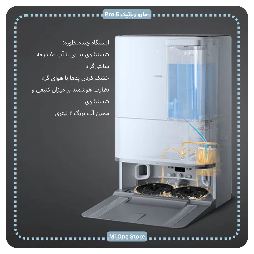 جارو رباتیک ۵ پرو مجهز به یک ایستگاه پایه پیشرفته است که عملیات شستشو و نگهداری را بدون دخالت شما انجام میدهد. این ایستگاه دارای شستشوی پد تی با آب ۸۰ درجه سانتیگراد برای حذف لکههای سخت، خشک کردن پدها با هوای گرم در کمتر از دو ساعت، نظارت هوشمند بر میزان کثیفی و شستشوی دوباره در صورت نیازر، مخزن آب بزرگ ۴ لیتری برای پوشش تا ۴۰۰ متر مربع تنها با یک بار پر کردن است.