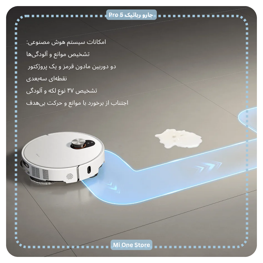 تمیز کردن خانه همیشه یکی از کارهای وقتگیر و خستهکننده بوده است. جدیدترین محصول شیائومی جارورباتیک شیائومی مدل ۵ پرو میباشد که با بهرهگیری از هوش مصنوعی، قدرت مکش فوقالعاده، سیستم اجتناب از موانع و ایستگاه پایه خودتمیزشونده دارد. یکی از مهمترین نقاط قوت جارورباتیک ۵ پرو هوش مصنوعی پیشرفته آن است. این دستگاه به دوربین RGB، دو دوربین مادون قرمز و یک پروژکتور نقطهای سهبعدی مجهز میباشد. Xiaomi Robot Vacuum 5 Pro امکان اتصال به سایر محصولات هوشمند شیائومی را دارد، انتخابی ایدهآل برای خانههای مدرن است. ما استفاده از این جارورباتیک هوشمند را به شما پیشنهاد میکنیم.